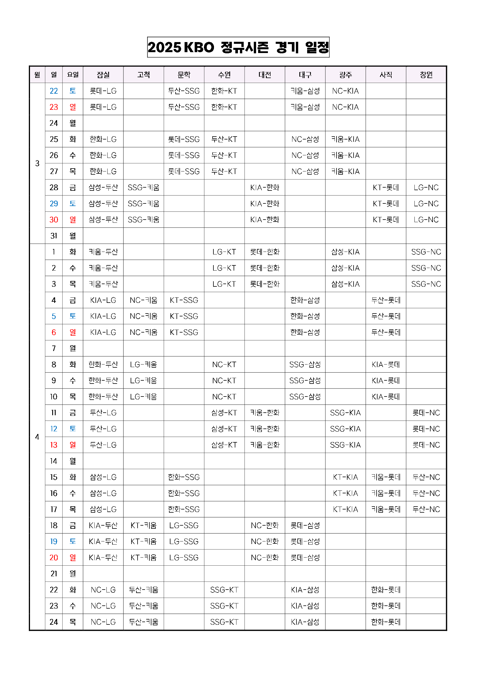 2025년 KBO 리그는 야구 팬들에게 뜨거운 열정과 재미를 선사할 준비를 마쳤습니다. 이번 시즌의 개막전 정보와 정규시즌 일정을 한눈에 확인해보세요.